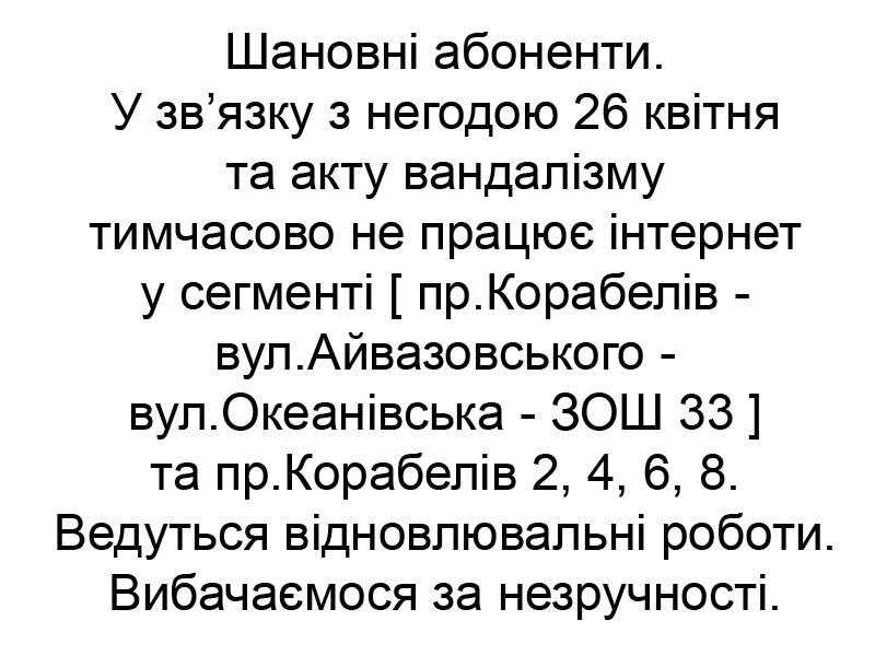 У ці непрості для країни дні ми докладаємо всіх зусиль, щоб ви залишалися на зв'язку та отримували актуальну інформацію. Тому, починаючи з 01.03.2022, навіть якщо ви не змогли оплатити ваш тариф, то доступ до інтернету залишиться на обмеженій швидкості. Однак, якщо ви маєте можливість, просимо внести плату за вашим тарифом, щоб ми могли продовжувати підтримувати мережу.